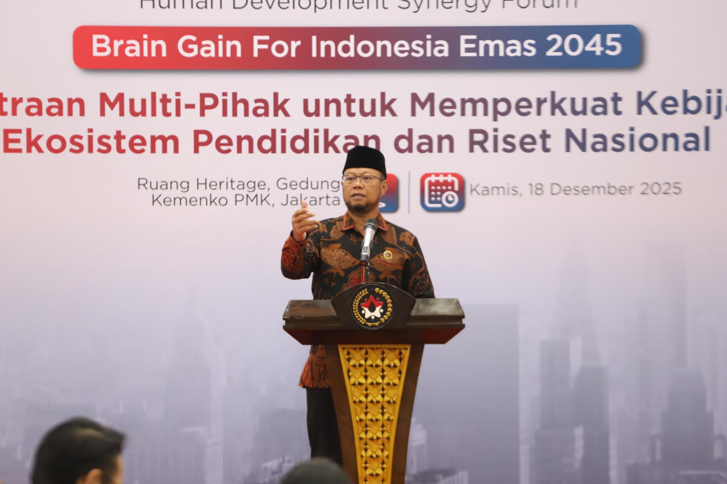 Upaya tersebut mengemuka dalam Human Development Synergy Forum bertajuk Kemitraan Multi-Pihak untuk Memperkuat Kebijakan Ekosistem Pendidikan dan Riset Nasional: Brain Gain untuk Indonesia Emas 2045 yang diselenggarakan di Aula Heritage Kemenko PMK, pada Kamis (18/12/2025).