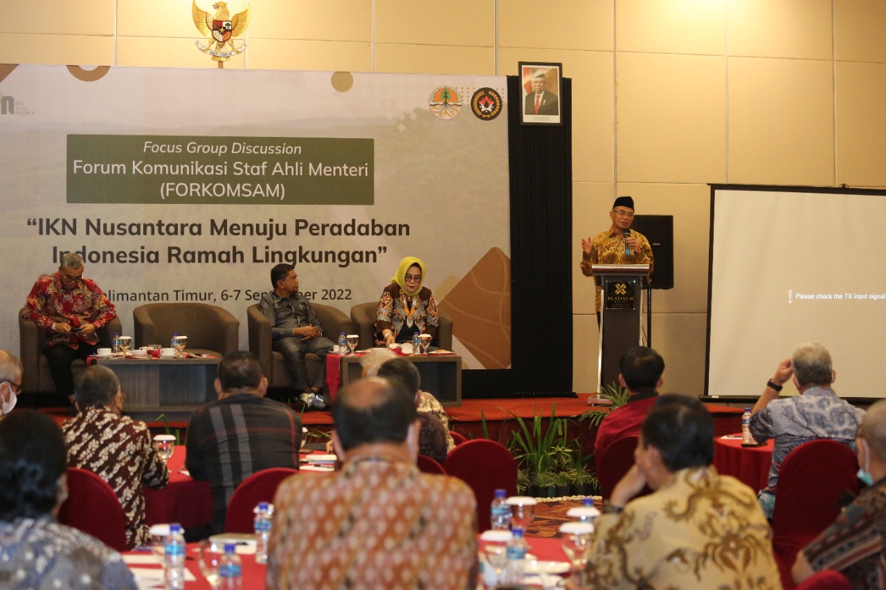 Forum Komunikasi Staf Ahli Menteri pada kali ini mengusung tema "IKN Nusantara Menuju Peradaban Indonesia Ramah Lingkungan". Hal tersebut penting dilakukan sebagai bentuk komitmen antar Kementerian/Lembaga terhadap adanya pembangunan IKN Nusantara.