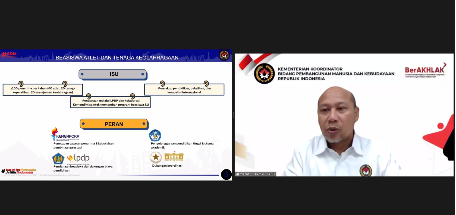 KEMENKO PMK -- Deputi Bidang Koordinasi Penguatan Karakter dan Jati Diri Bangsa Kementerian Koordinator Bidang Pembangunan Manusia dan Kebudayaan (Kemenko PMK) Warsito memimpin Rapat Koordinasi Persiapan Rapat Tingkat Menteri (RTM) Percepatan Program Prioritas Olahraga Nasional secara daring, Rabu (11/2/2026).