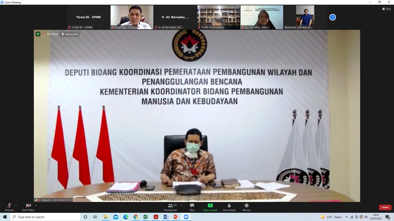 “Perlu adanya perhatian untuk penyelesaian pembangunan sektor-sektor lain selain sektor pemukiman” tutur Plt Deputi 2 Didik Suhardi saat memaparkan laporan progres penanganan pasca bencana Sulteng secara daring pada Kamis (29/7).