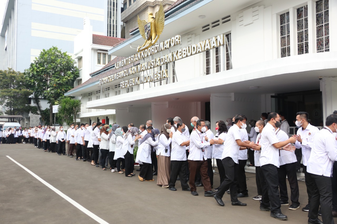 KEMENKO PMK - Pasca libur Hari Raya Idul Fitri 1443 Hijriah, Kementerian Koordinator Bidang Pembangunan Manusia dan Kebudayaan (Kemenko PMK) menggelar tradisi halal bihalal bersama seluruh pegawai di hari pertama masuk kerja.
