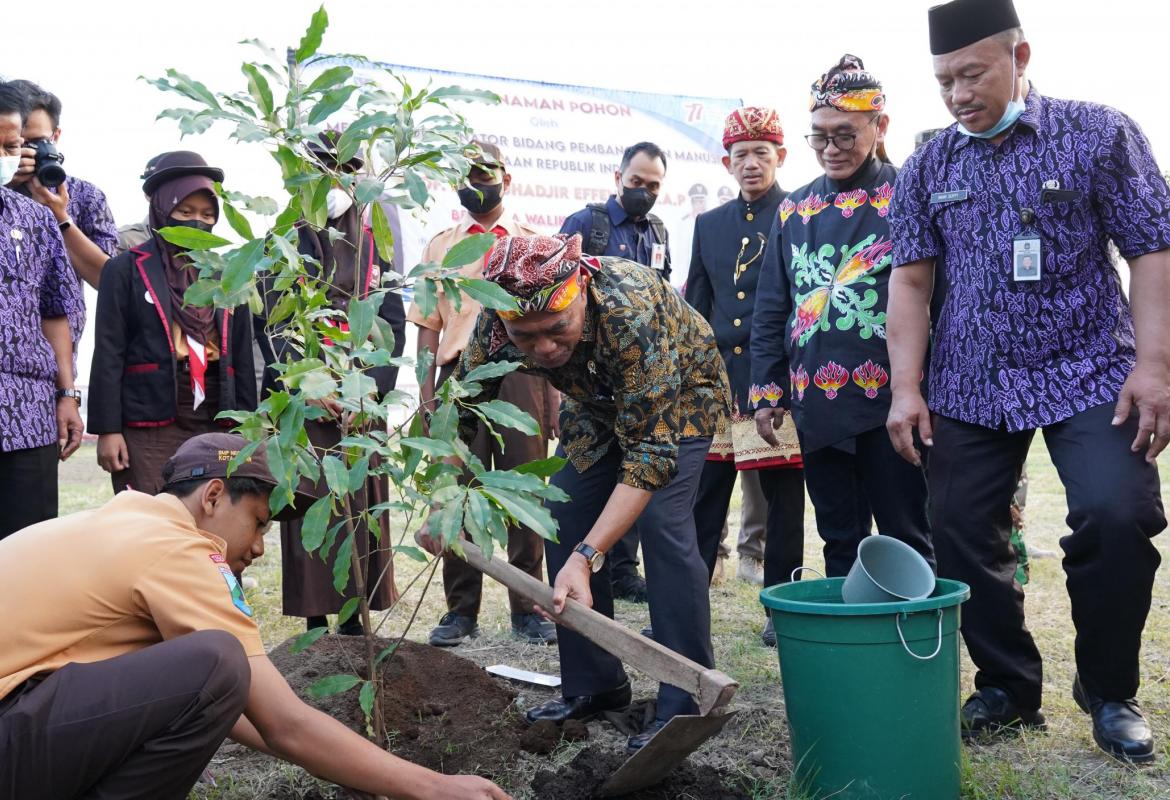 Menko PMK melakukan penanaman pohon di SMP Negeri 3 Blitar, Sabtu, (27/8/2022).