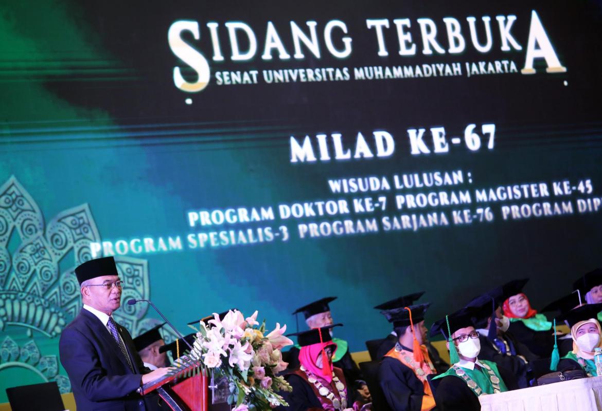 Menko PMK saat memberi orasi ilmiah pada Upacara Wisuda Universitas Muhammadiyah Jakarta (UMJ) Program Doktor Ke-6, M