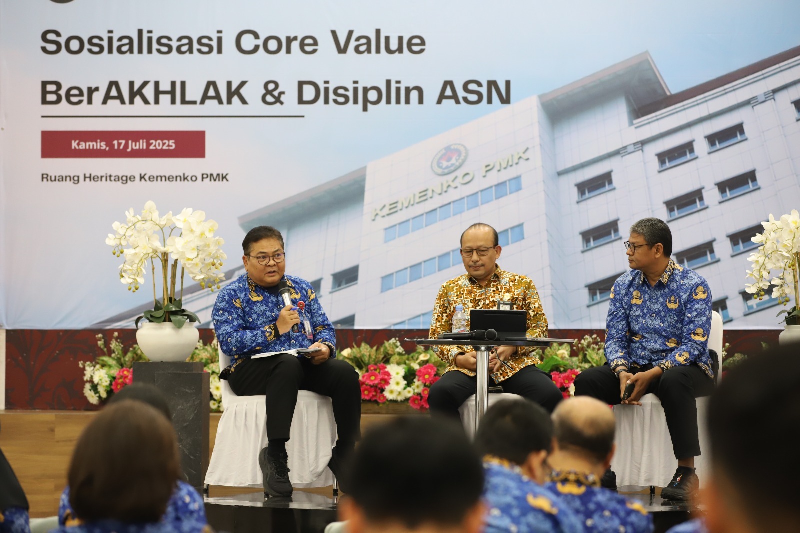 KEMENKO PMK -- Kementerian Koordinator Bidang Pembangunan Manusia dan Kebudayaan (Kemenko PMK) menyelenggarakan Sosialisasi Core Value BerAKHLAK dan Disiplin Aparatur Sipil Negara (ASN) di lingkungan Kemenko PMK, bertempat di Ruang Heritage Kantor Kemenko PMK, pada Kamis (17/7/2025).