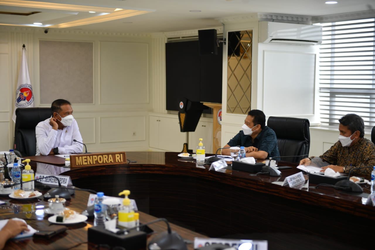 KEMENKO PMK -- Deputi Bidang Koordinasi Revolusi Mental, Pemajuan Kebudayaan, dan Prestasi Olahraga Didik Suhardi beraudiensi kepada Menteri Pemuda dan Olahraga Republik Indonesia (Menpora RI), Zainudin Amali, terkait Koordinasi Implementasi Desain Besar Olahraga Nasional (DBON), pada Jumat (17/6)