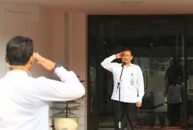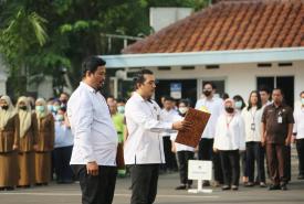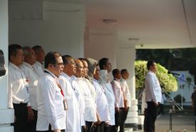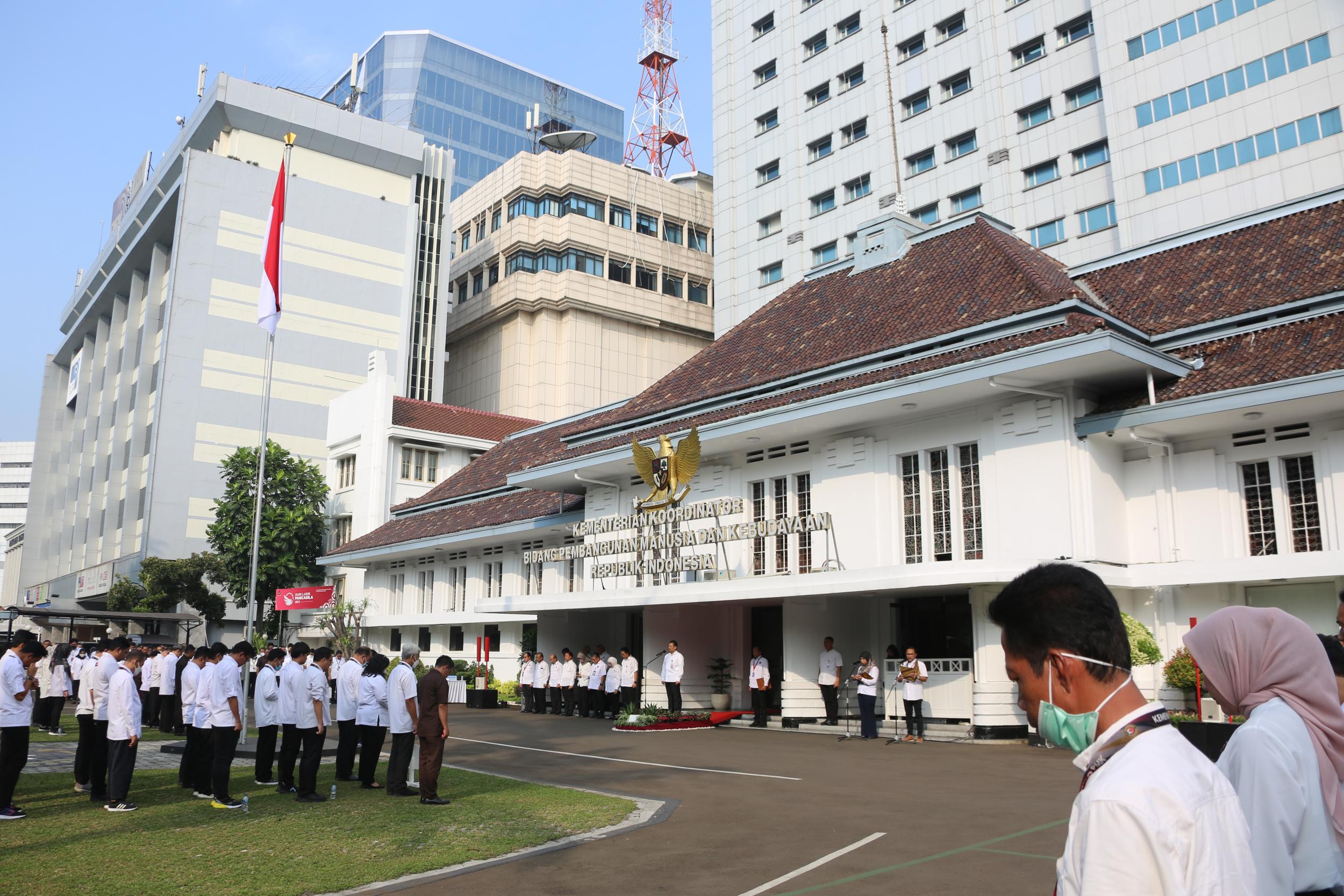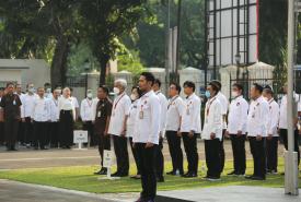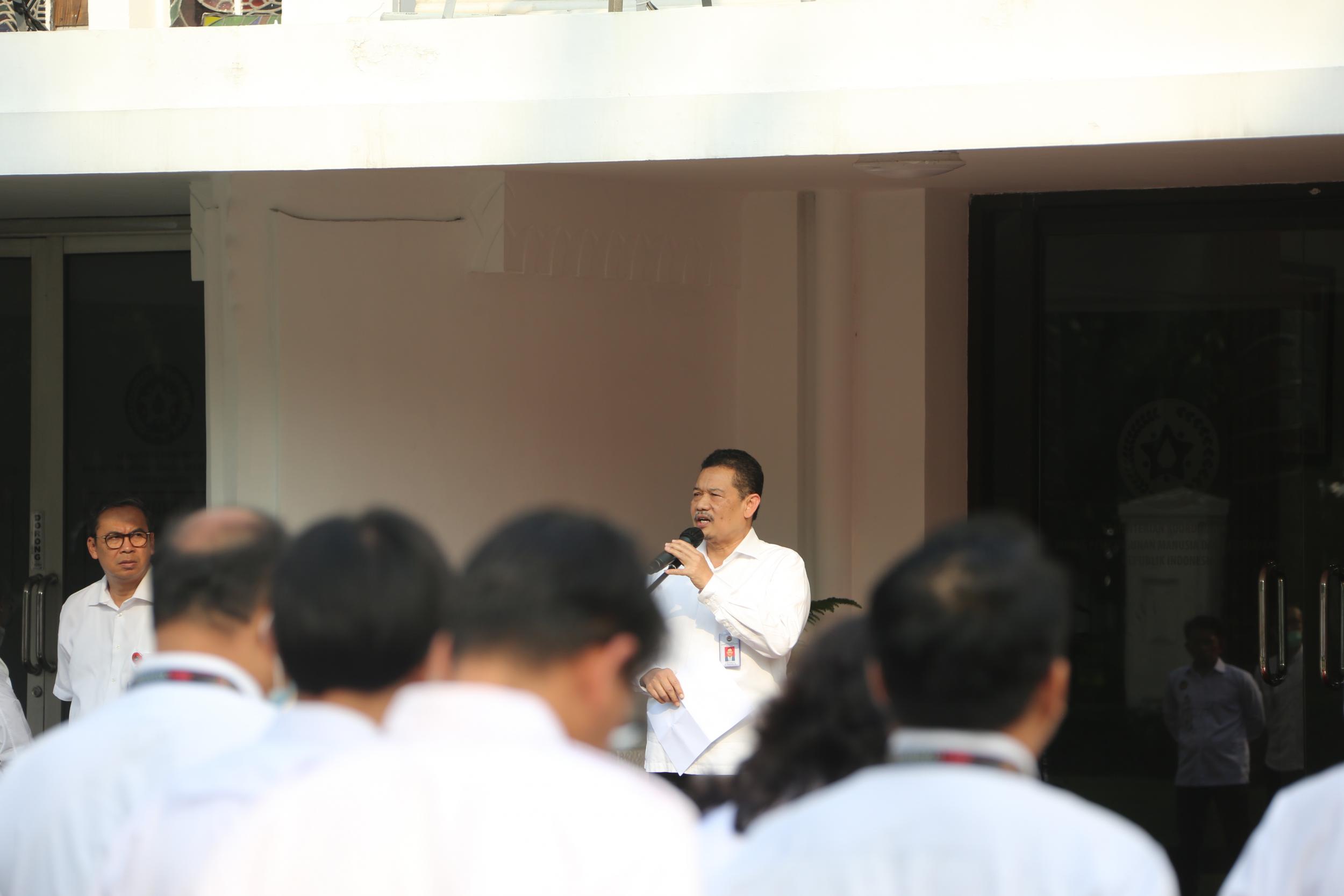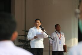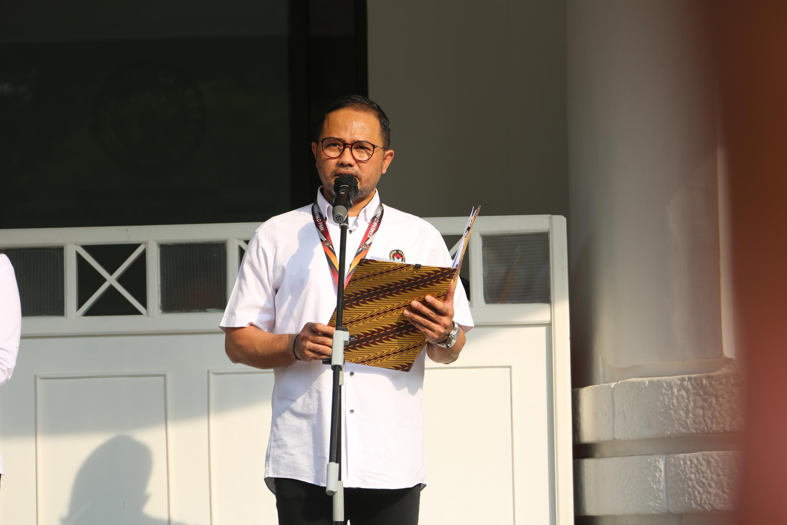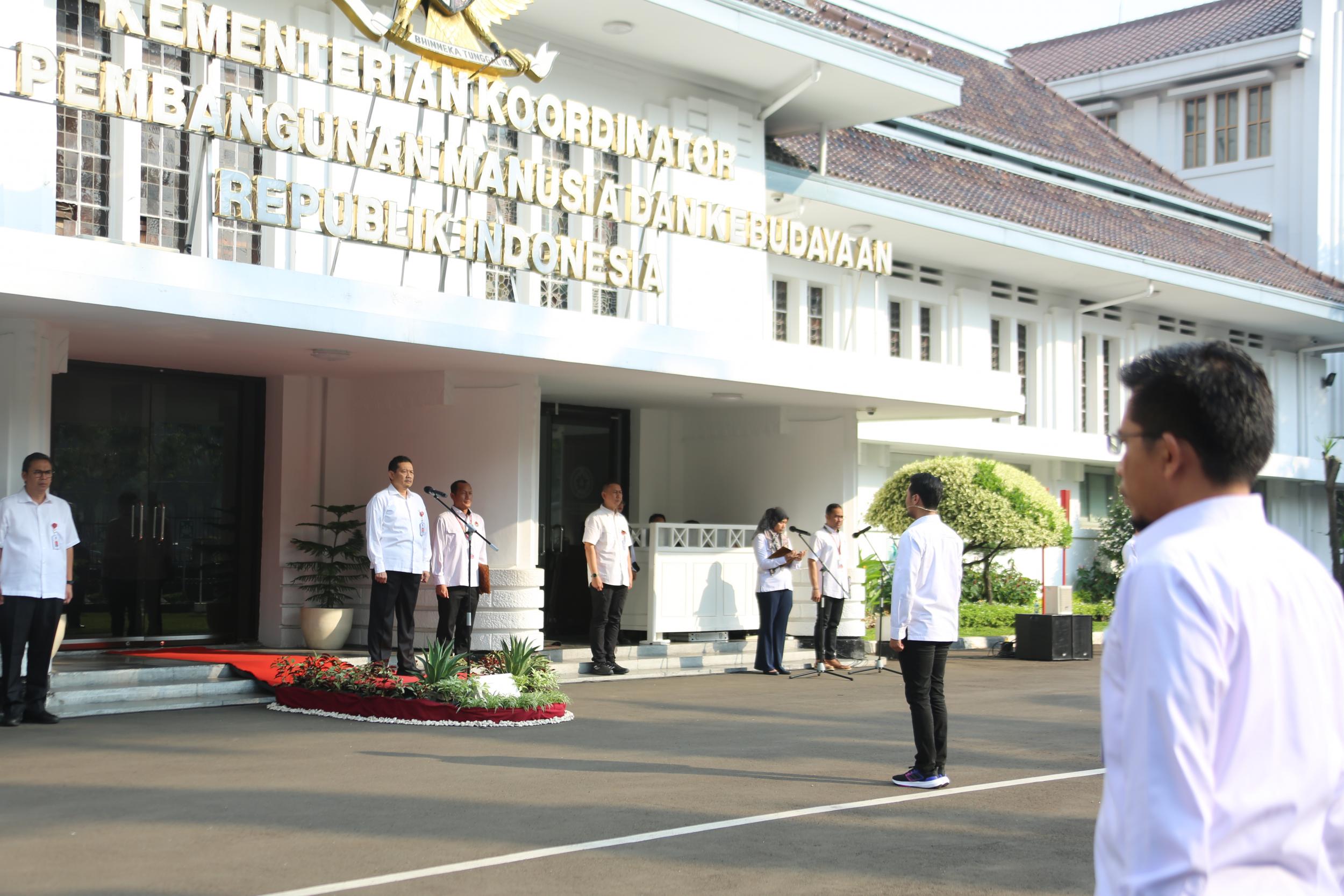 KEMENKO PMK -- Deputi Bidang Koordinasi Revolusi Mental Pemajuan Kebudayaan, dan Prestasi Olahraga Kementerian Koordinator Bidang Pembangunan Manusia dan Kebudayaan (Kemenko PMK) Didik Suhardi memimpin Apel Pagi yang diikuti oleh seluruh pegawai Kemenko PMK, pada Senin (12/6) yang digelar di Halaman Kemenko PMK.