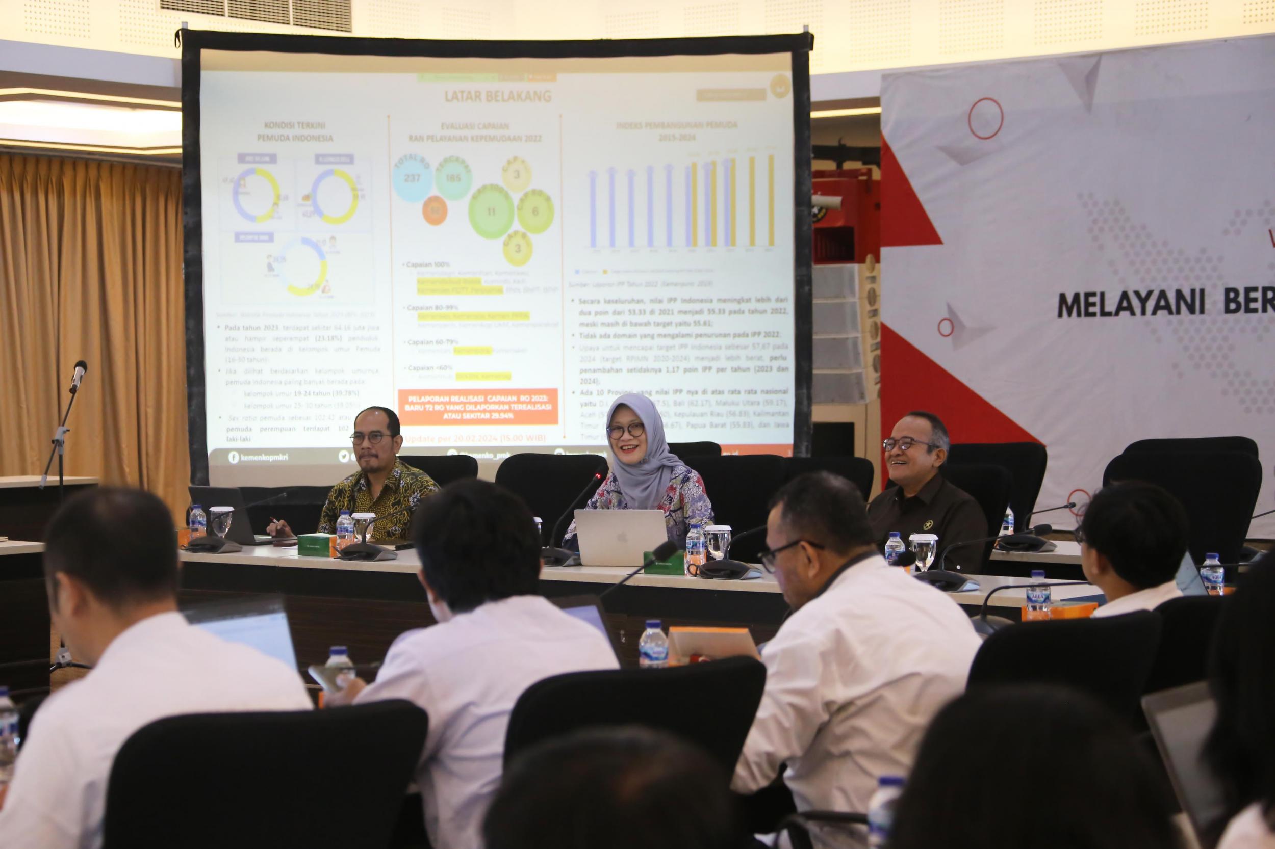KEMENKO PMK — Deputi Peningkatan Kualitas Anak, Perempuan, dan Pemuda Kemenko PMK Woro Srihastuti Sulistyaningrum (Lisa) menyampaikan perlu percepatan pelaksanaan rincian output (RO) di tahun 2024 guna meningkatkan Indeks Pembangunan Pemuda (IPP) pada akhir pelaksanaan Rencana Aksi Nasional (RAN) Pelayanan Kepemudaan Tahun 2021-2024.