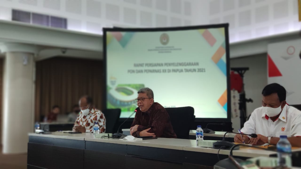 Jakarta (10/7) -- Kementerian Koordinator Bidang Pembangunan Manusia dan Kebudayaan (Kemenko PMK) menggelar Rapat Koordinasi Persiapan Penyelenggaraan PON XX dan Peparnas XVI Papua Tahun 2021 pada Rabu (9/7). Rapat dihadiri oleh Panitia Besar PON Papua, KONI, Kemenpora, Sekretariat Kabinet, dan Kementerian PUPR.