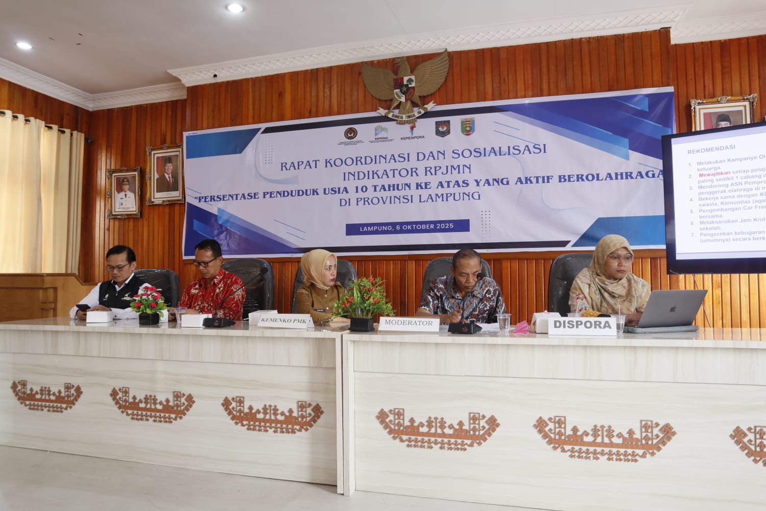 KEMENKO PMK — Kementerian Koordinator Bidang Pembangunan Manusia dan Kebudayaan (Kemenko PMK) melalui Deputi Bidang Penguatan Karakter dan Jati Diri Bangsa menyelenggarakan Rapat Koordinasi dan Sosialisasi Indikator RPJMN tentang pembudayaan olah raga melalui indikator “Persentase Penduduk Usia 10 Tahun ke Atas yang Aktif Berolahraga” di Provinsi Lampung, Senin (6/10).