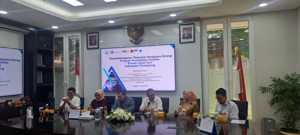 KEMENKO PMK -- Kementerian Koordinator Bidang Pembangunan Manusia dan Kebudayaan (Kemenko PMK) melalui Deputi Bidang Koordinasi Peningkatan Kesejahteraan Sosial menyaksikan penandatanganan kerjasama sinergi Program Peningkatan Kualitas Rumah Tidak Layak Huni Kabupaten Pandeglang, bertempat di Gedung GRHA PT.SMF, pada Jumat (17/7/2023).