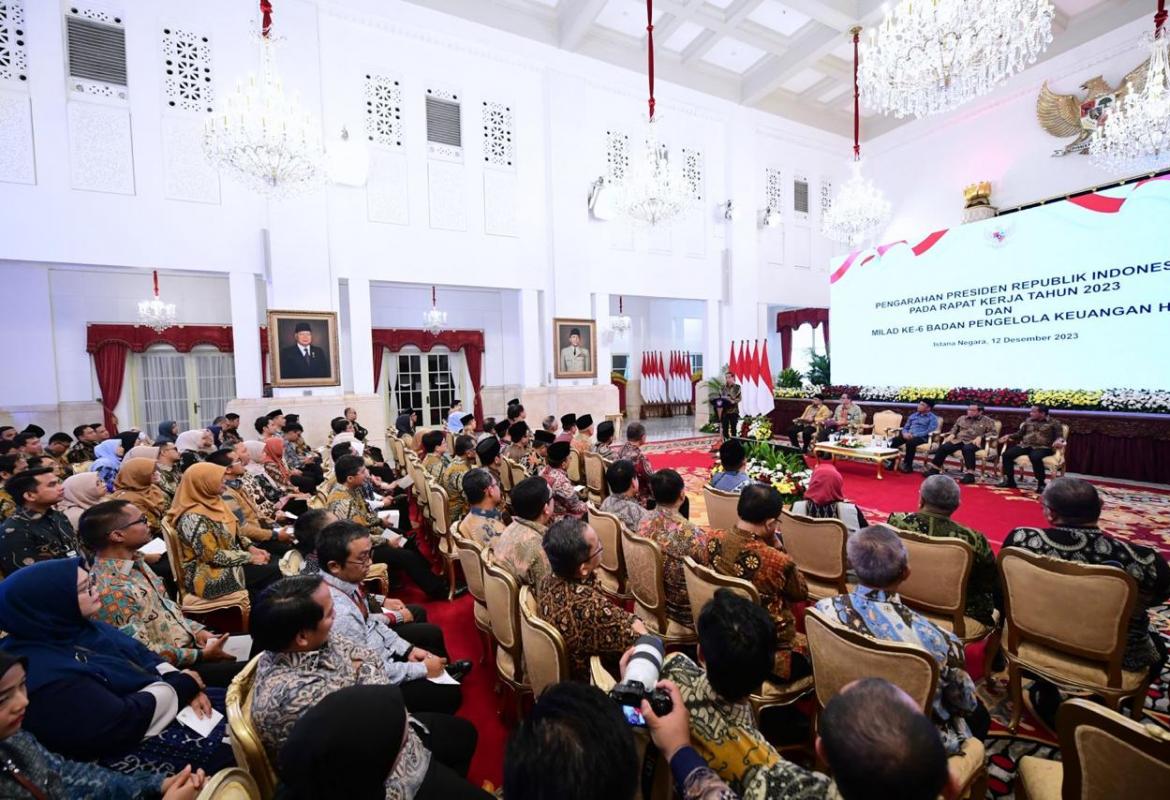 Presiden Joko Widodo membuka Rapat Kerja (Raker) Tahun 2023 dan Milad ke-6 Badan Pengelola Keuangan Haji (BPKH) di Is