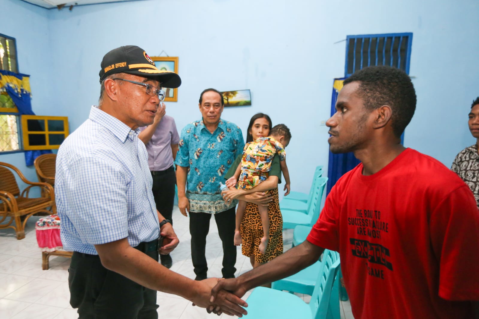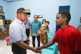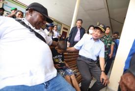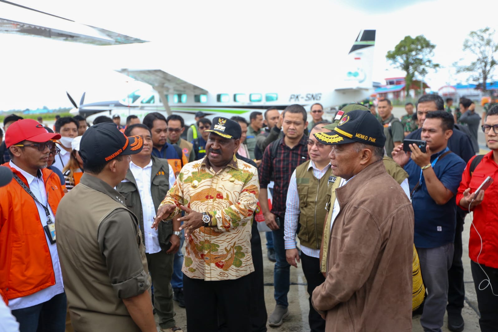 Menko PMK Muhadjir Effendy bersama Kepala BNPB Suharyanto memberikan bantuan sosial secara simbolis di bandara Mozes Kilangin, Timika, pada Rabu (2/8/2023). Bantuan sosial tersebut selanjutnya dikirimkan untuk korban kekeringan dan kelaparan di Kabupaten Puncak, Papua Tengah.