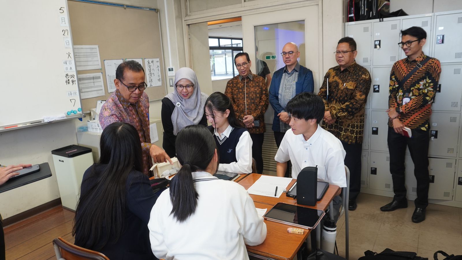 Menko PMK menjelaskan bahwa kunjungan ke Kindai University High School bertujuan untuk studi banding kebijakan pendidikan berbasis Artificial Intelligence (AI) di jenjang sekolah menengah. Dalam kesempatan tersebut, Menko PMK meninjau langsung proses pembelajaran Bahasa Inggris di kelas yang dilakukan dengan dukungan teknologi AI.