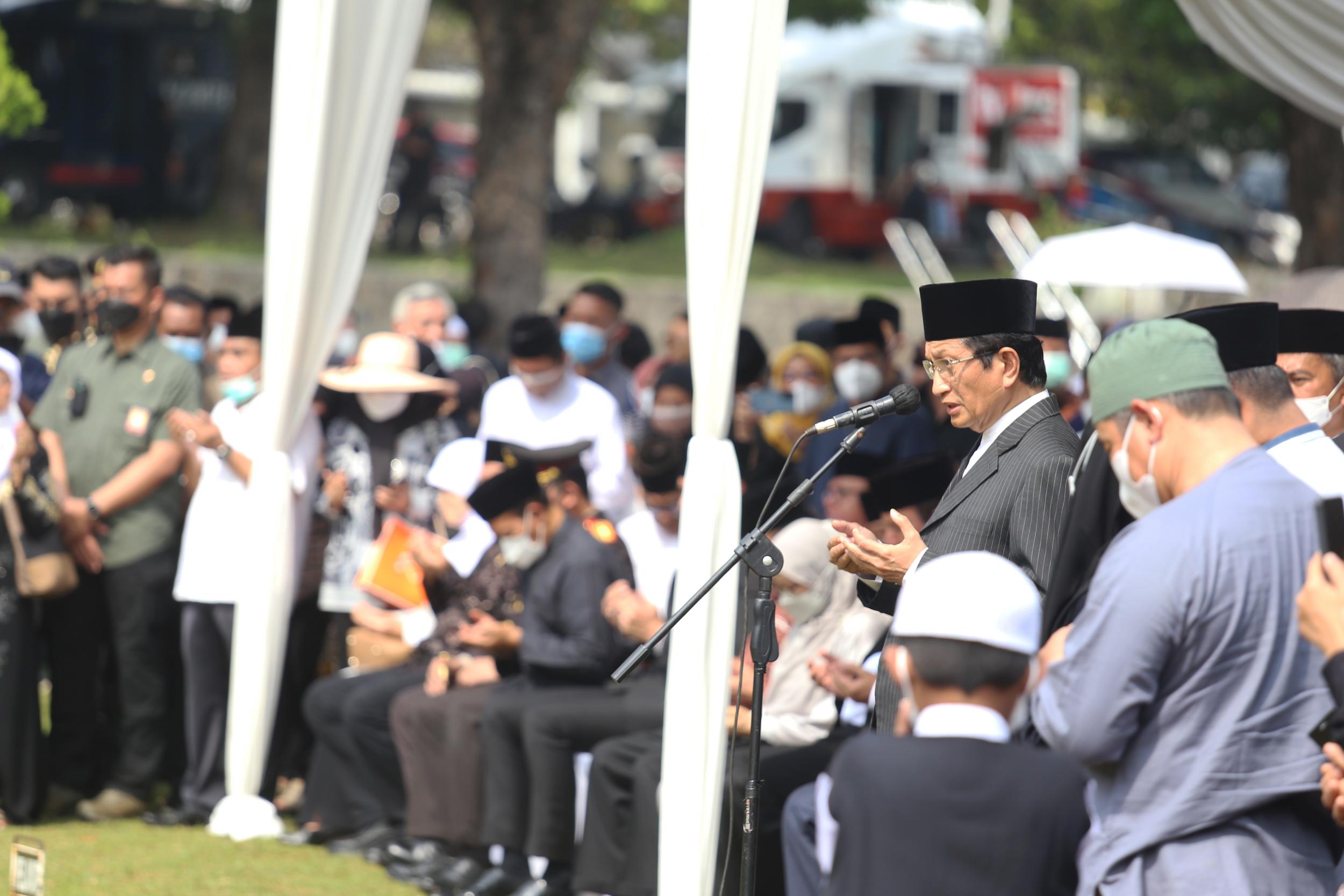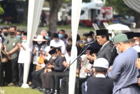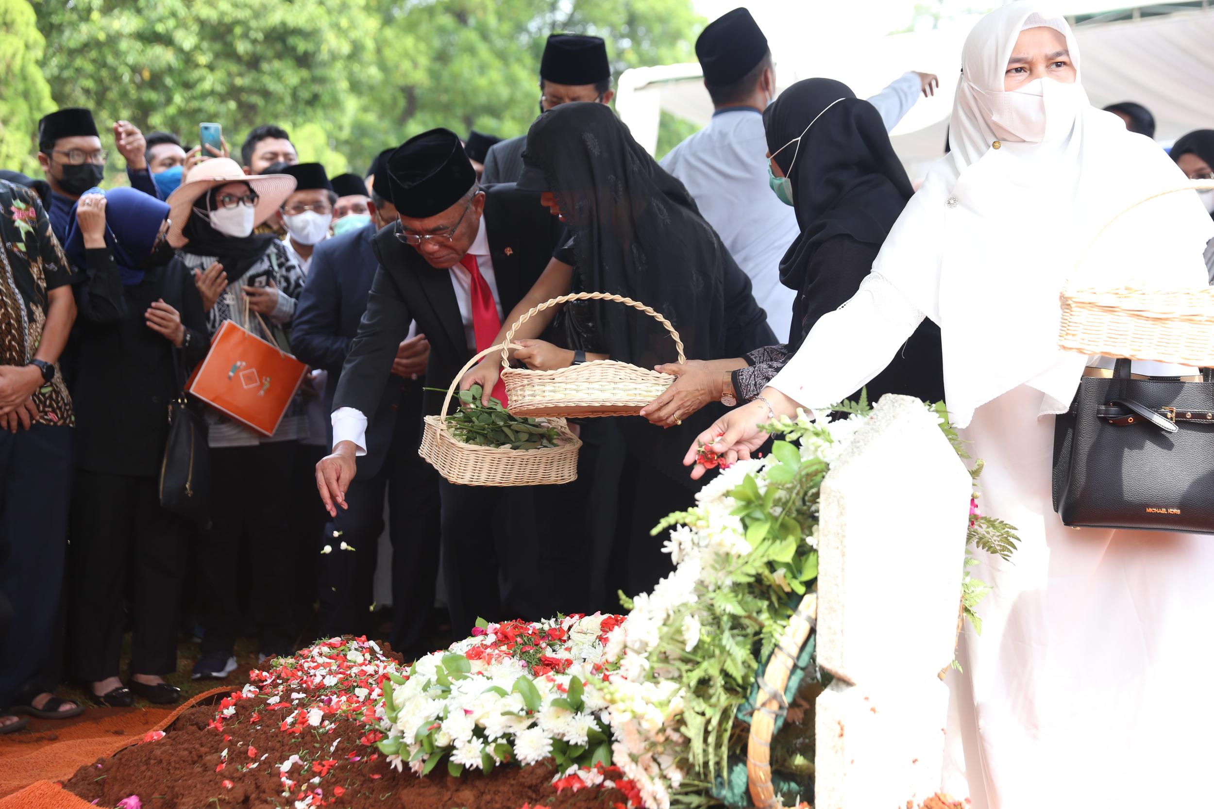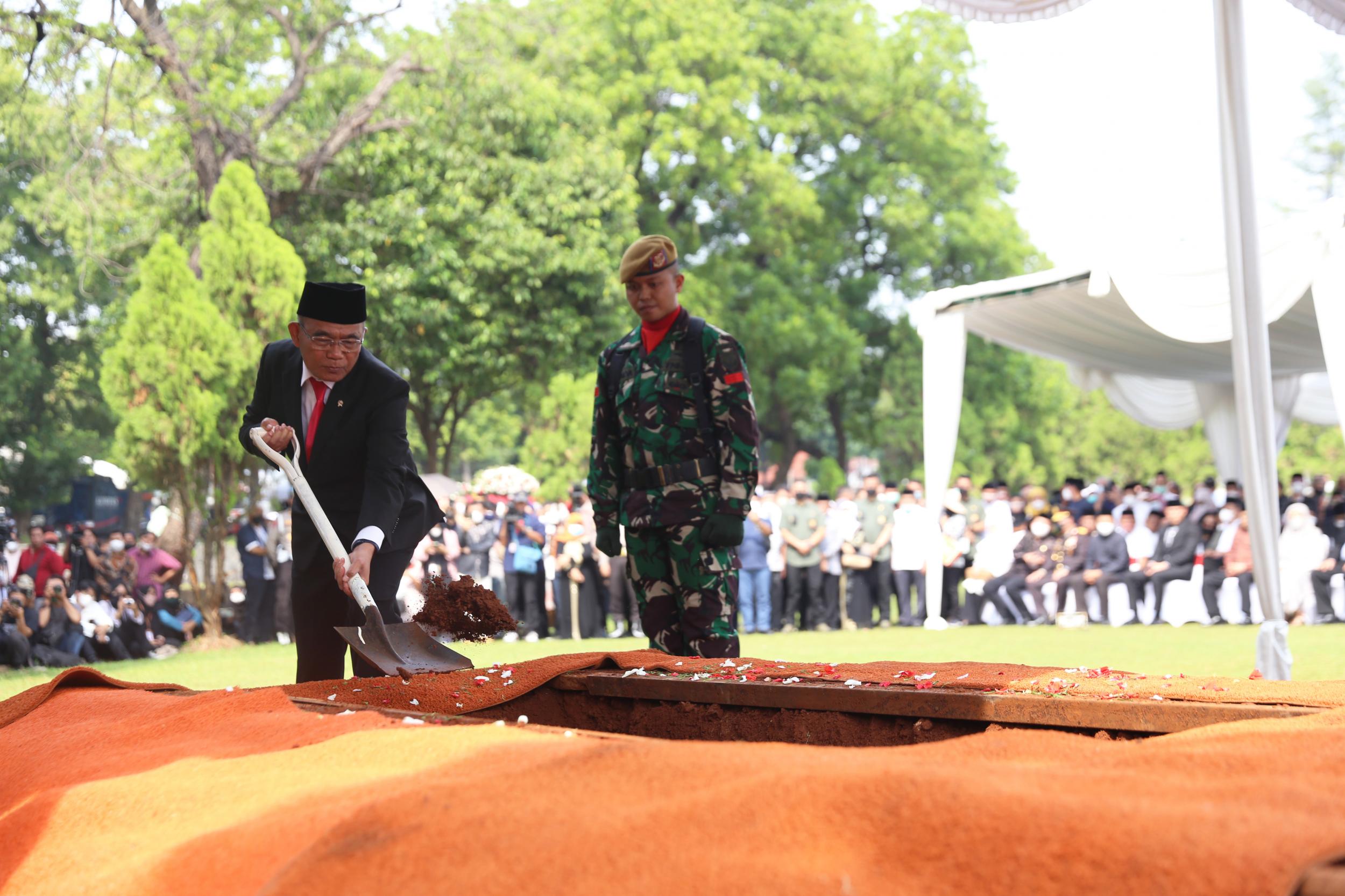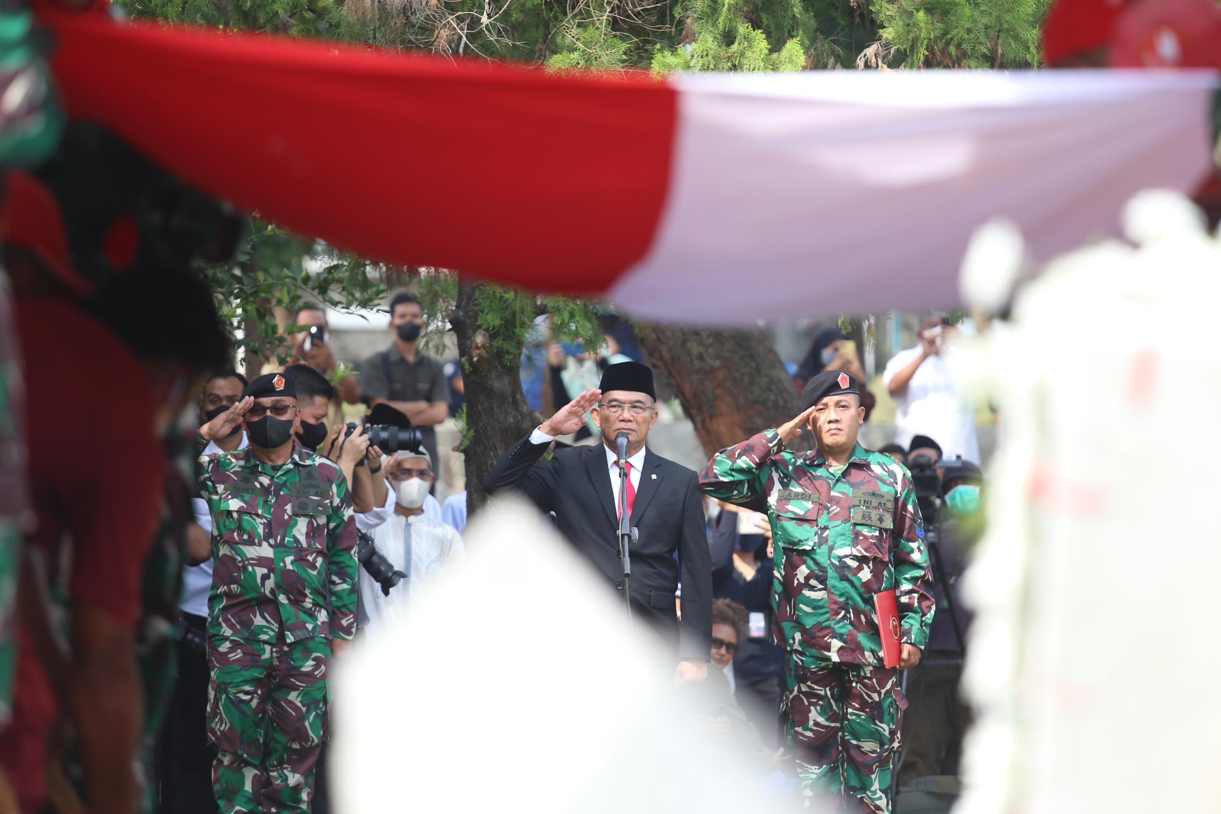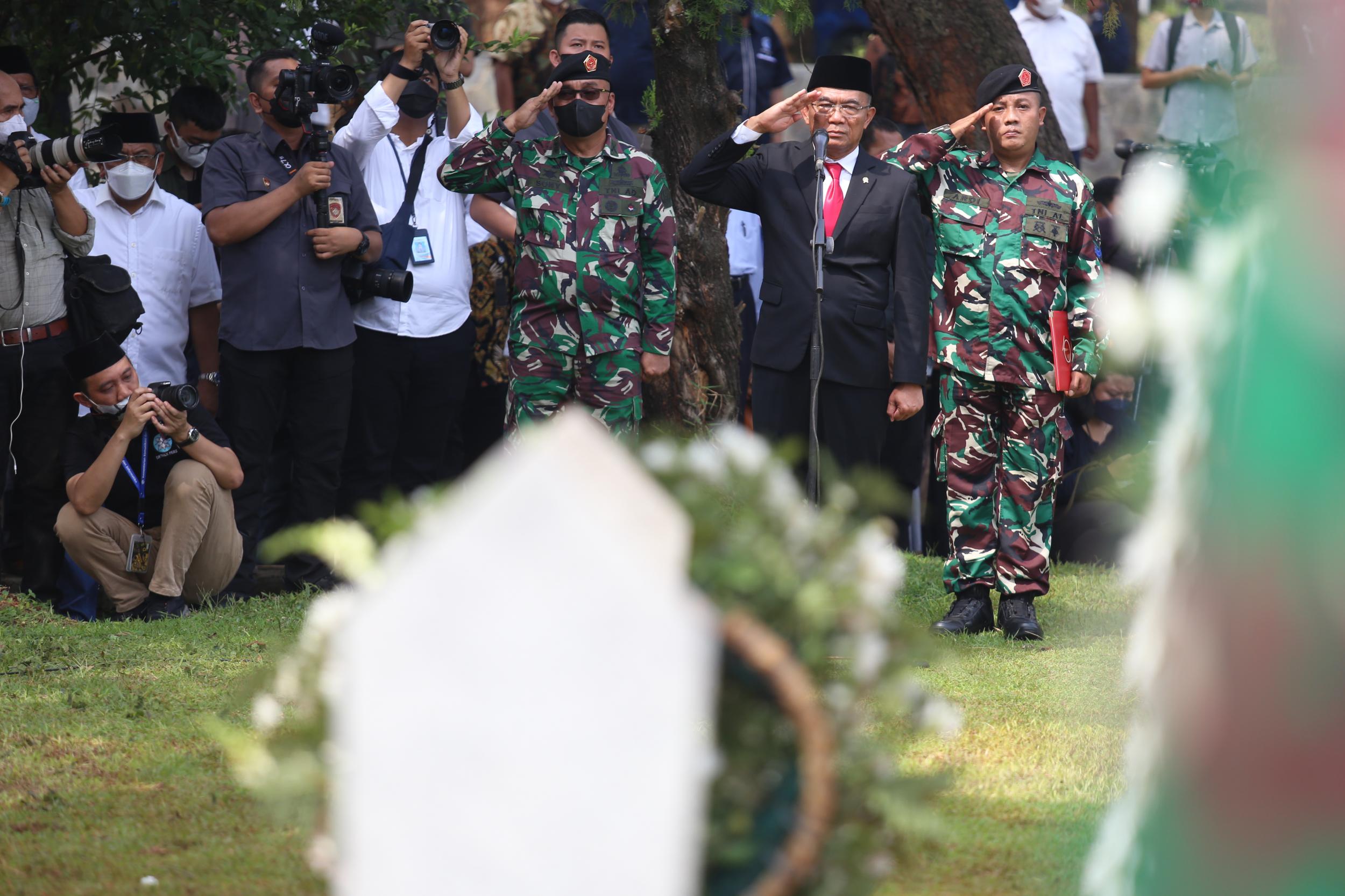 Menteri Koordinator Bidang Pembangunan Manusia dan Kebudayaan Muhadjir Effendy menjadi inspektur upacara pemakaman Azyumardi Azra di Taman Makam Pahlawan Kalibata, Jakarta, Selasa (20/9).