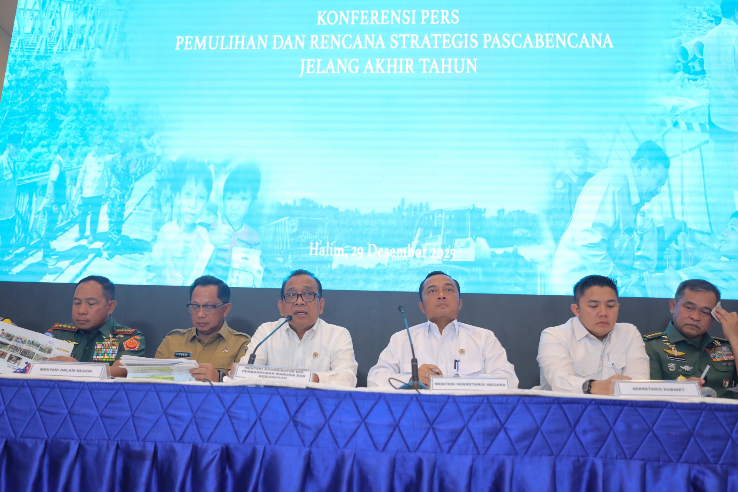 Hal tersebut disampaikan Menko PMK dalam Konferensi Pers Tanggap Bencana Sumatra yang digelar di Base Ops Bandara Halim Perdanakusuma, Jakarta, pada Senin (29/12/2025).