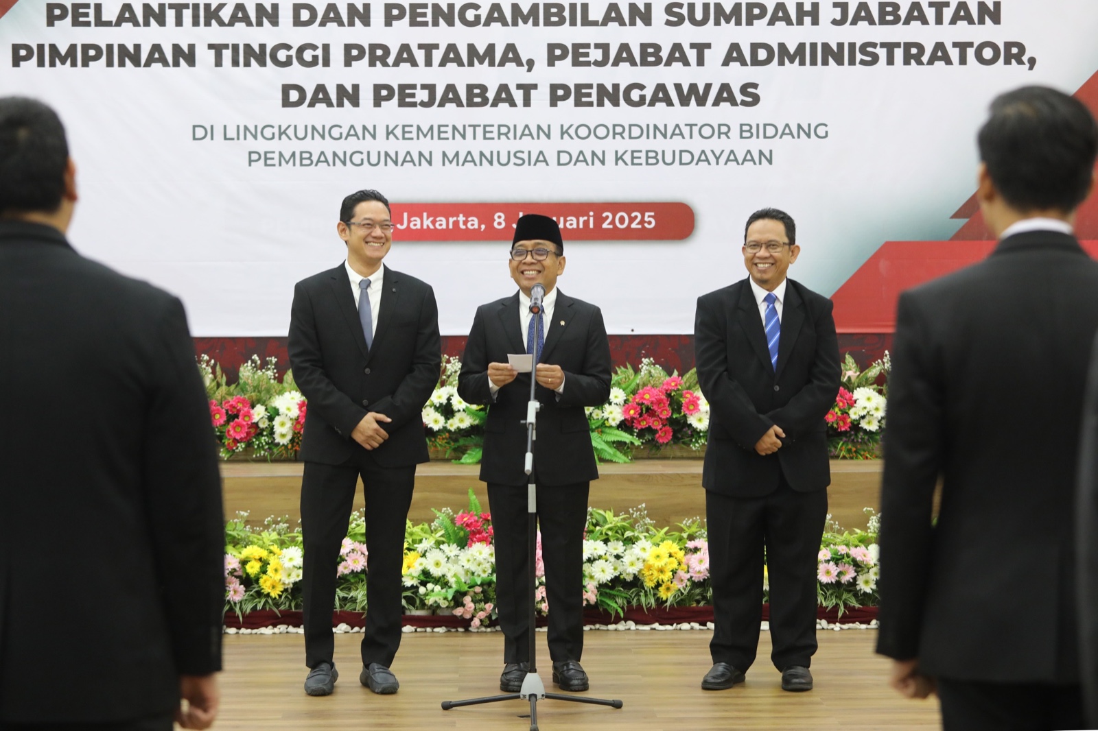 KEMENKO PMK – Menteri Koordinator Bidang Pembangunan Manusia dan Kebudayaan (Menko PMK) Pratikno melantik Pejabat Pimpinan Tinggi Pratama, Pejabat Administrator, dan Pejabat Pengawas Kemenko PMK, di Aula Heritage Kemenko PMK, pada Rabu (8/1/2025).