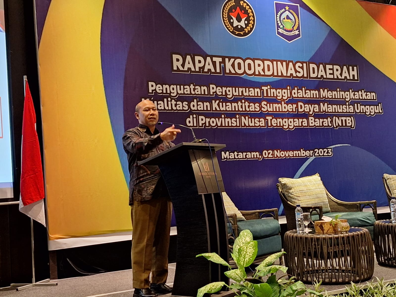 Rapat koordinasi ini pun dihadiri oleh Sekretaris Daerah Provinsi NTB Drs. H. Fathurrahman, M.Si, Rektor Universitas Mataram, Prof. Ir. Bambang Hari Kusumo, SH., M.Agr.Sc., Ph.D., Wakil Rektor Bidang Akademik Universitas Mataram, Dr. Sitti Hilyana., Asdep Pendidikan Vokasi dan Pendidikan Tinggi Kemenko PMK, Dr. Ahmad Saufi, Direktur Kelembagaan Kemendikbudristek, Dr. Lukman, S.T., M.Hum, Kepala Bappeda Provinsi NTB, Dr. Ir. H. Iswandi, M.Si dan Para Rektor serta Direktur Perguruan Tinggi di Provinsi NTB