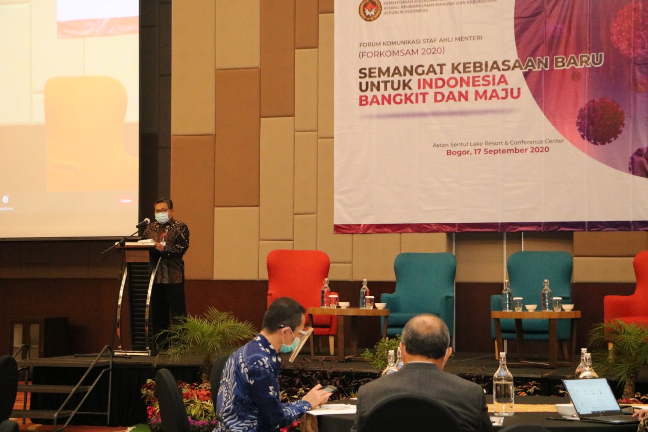 Guna membahas langkah-langkah strategis dalam masa adaptasi kebiasaan baru, Kementerian Koordinator Bidang Pembangunan Manusia dan Kebudayaan (Kemenko PMK) kembali mengadakan Forum Komunikasi Staf Ahli Menteri (Forkomasam) dengan mengangkat tema “Semangat Kebiasaan Baru Untuk Indonesia Bangkit dan Maju”. Forum digelar secara langsung di Aston Sentul Lake Resort & Conference Centre Bogor, dan secara virtual melalui aplikasi Zoom, pada Kamis (17/9).