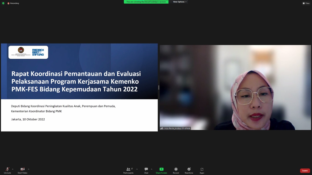 "Kerjasama ini mempunyai arti penting dan strategis bagi kami dalam rangka pembangunan pemuda salah satunya melalui usaha untuk meningkatkan capaian Indeks Pembangunan Pemuda di Indonesia," Jelasnya saat memberikan pengantar pada Rapat Koordinasi Pemantauan dan Evaluasi Pelaksanaan Program Kerjasama Kemenko PMK-FES Bidang Kepemudaan Tahun 2022 secara daring, Selasa (11/10/2022).