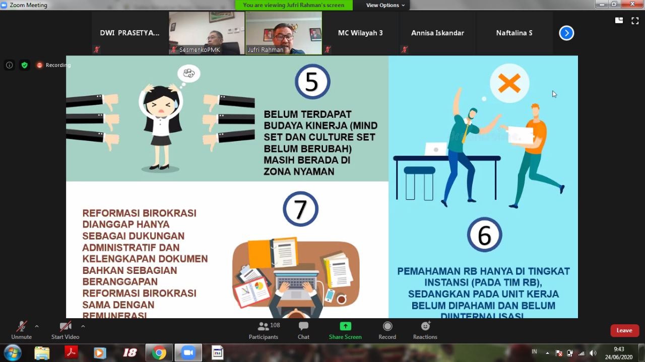 Jakarta (24/6) – Reformasi Birokrasi (RB) adalah salah satu terobosan untuk membuat suatu perubahan besar, terutama berkaitan erat dengan paradigma dan tata kelola pemerintahan di Indonesia.