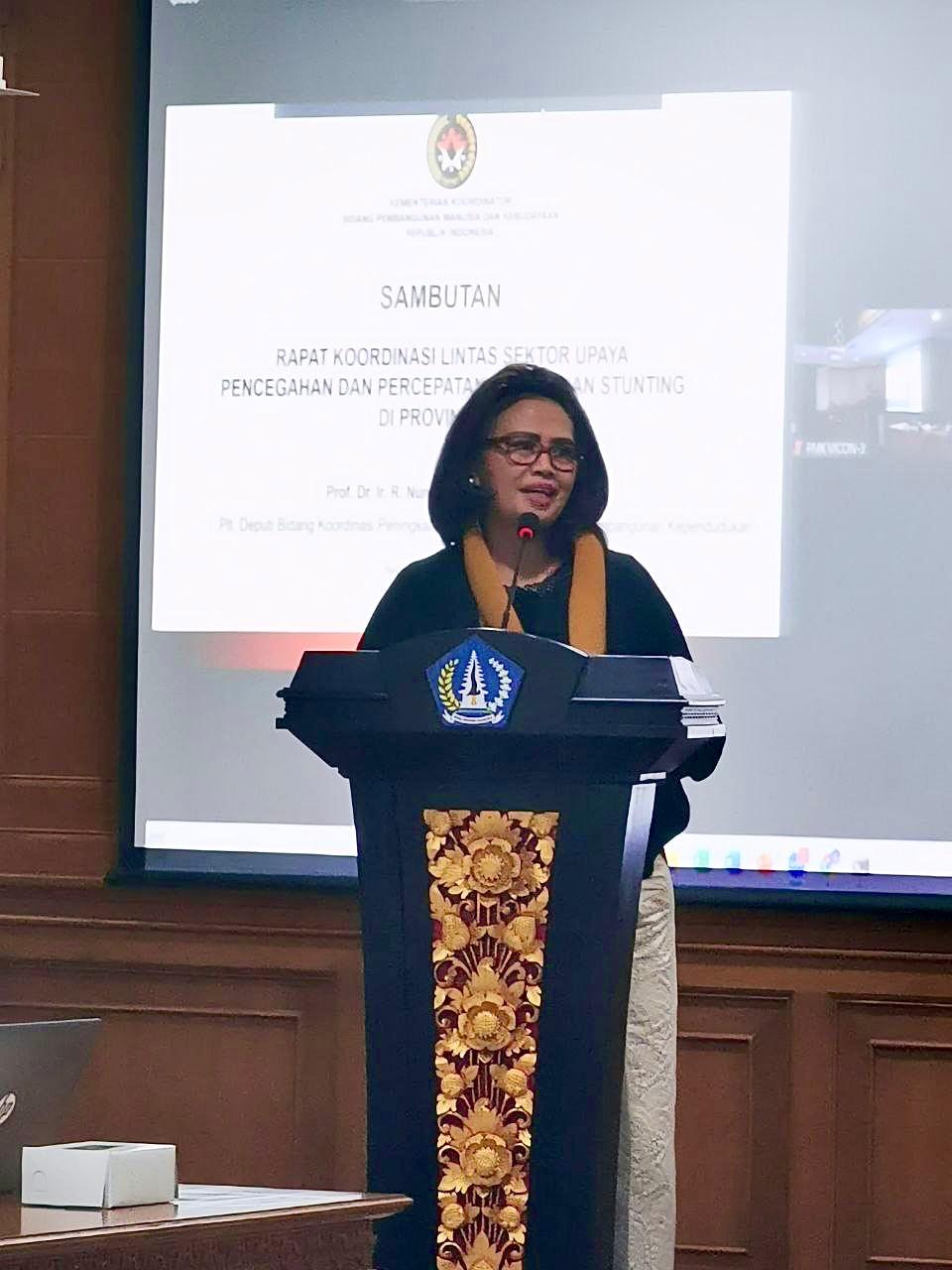 KEMENKO PMK – Asisten Deputi Ketahanan Gizi dan Promosi Kesehatan Kemenko PMK Jelsi Natalia Marampa mewakili Plt. Deputi Bidang Koordinasi Peningkatan Kualitas Kesehatan dan Pembangunan Kependudukan membuka dan memberikan sambutan dalam Rapat Koordinasi Lintas Sektor Upaya Pencegahan Percepatan Penurunan Stunting di Provinsi Bali, pada Jumat (20/9/2024).