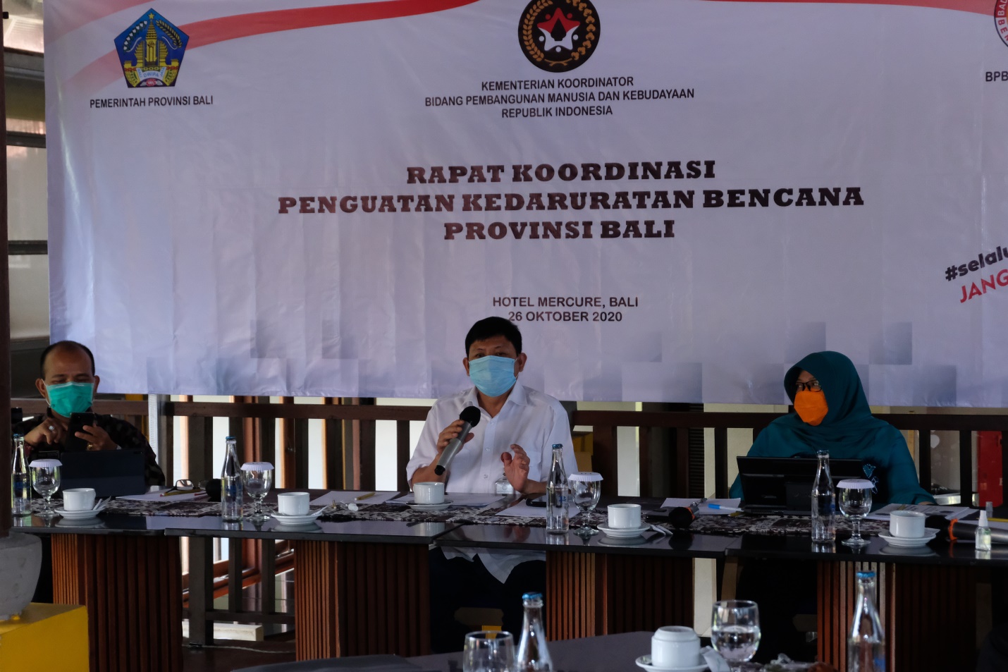Bali (26/10) -- Kementerian Koordinator Bidang Pembangunan Manusia dan Kebudayaan (Kemenko PMK) menyelenggarakan rapat koordinasi penguatan kedaruratan bencana di Provinsi Bali. Rapat dihadiri oleh Kalaksa BPBD Provinsi Bali, Kalaksa BPBD Kabupaten/Kota se-Provinsi Bali, perwakilan TNI/Polri, perwakilan Basarnas, dan Forum Relawan Provinsi Bali.