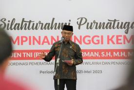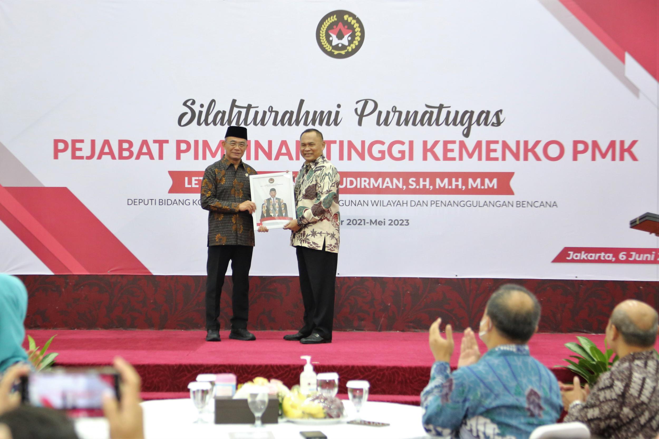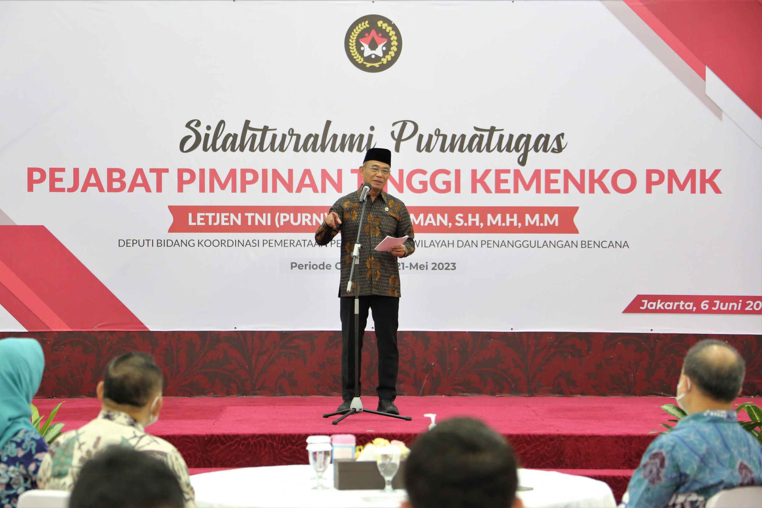 Menko PMK menghadiri acara silahturami purnatugas pejabat pimpinan tinggi Kemenko PMK Letjen TNI (purn) DR. Sudirman, S.H, M.H, M.M yang sebelumnya menjabat sebagai Deputi Bidang Koordinasi Pemerataan Pembangunan Wilayah dan Penanggulangan Bencana di Kemenko PMK.