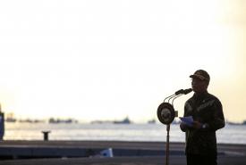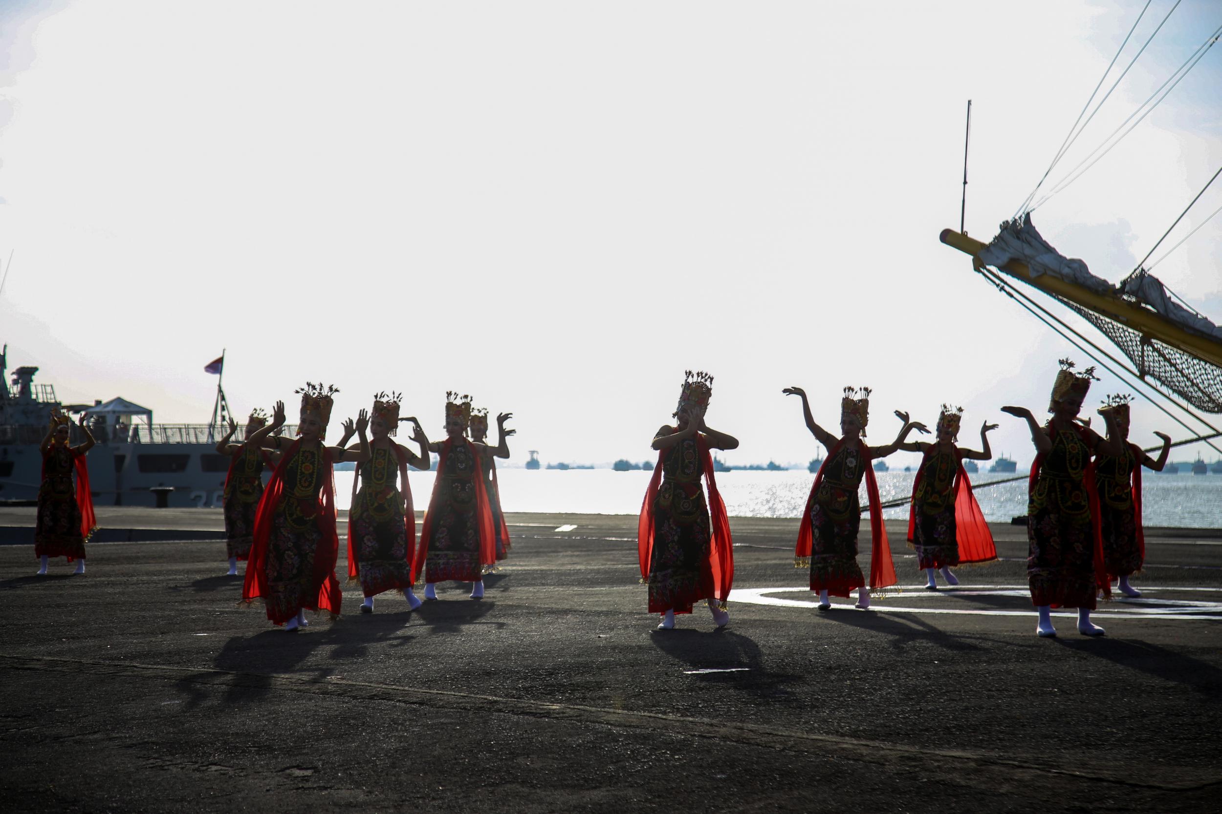 Menteri Koordinator Bidang Pembangunan Manusia dan Kebudayaan, Muhadjir Effendy bersama Laksada TNI Hutabarat, menyambut KRI Dewaruci dalam rangka kegiatan Muhibah Budaya Jalur Rempah, di Pangko Armada II, Surabaya pada Jumat (1/7/2022)