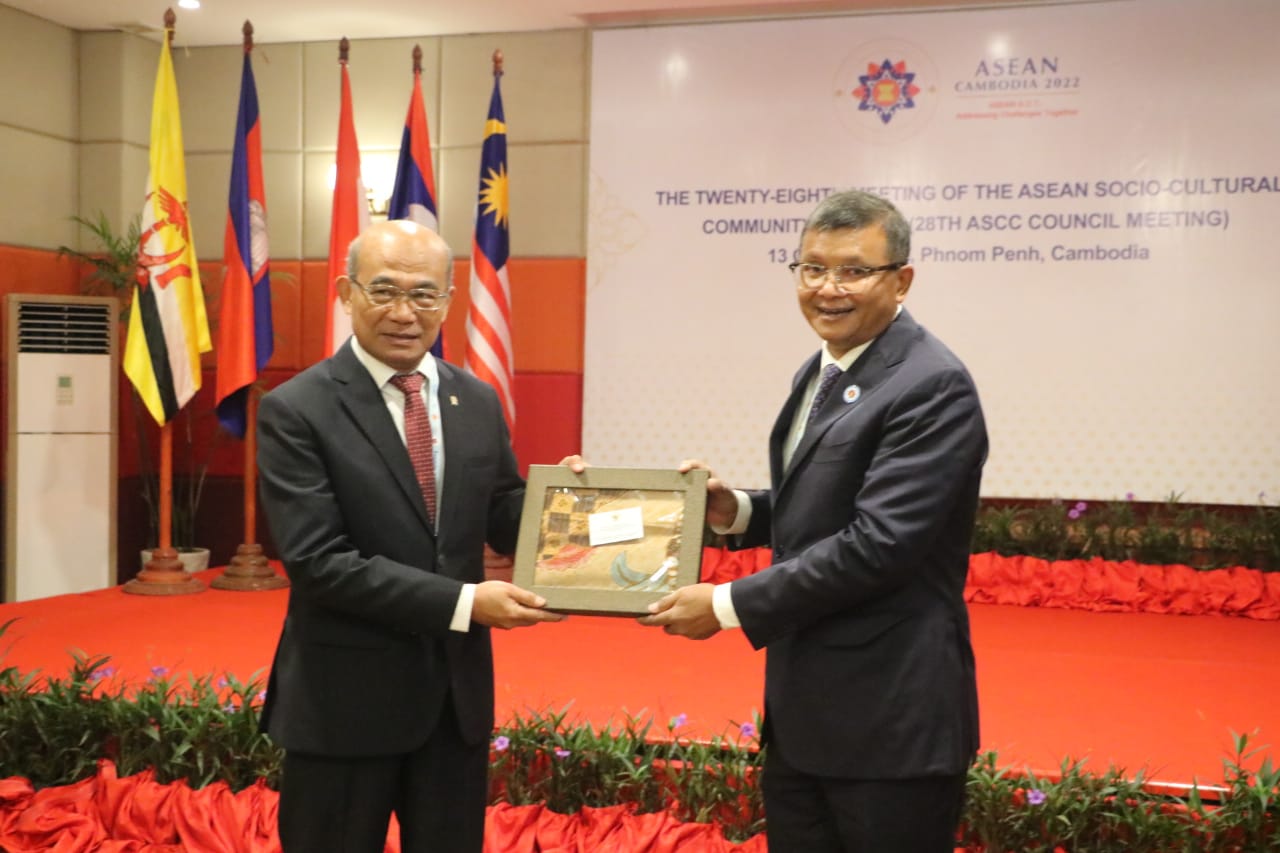 Menko PMK Muhadjir Effendy menyerahkan cenderamata kepada Menteri Pendidikan dan Kebudayaan Kambodja H.E. Dr. HANG Chuon Naron setelah acara pembukaan The ASEAN Socio-Cultural Community (ASCC) Council ke-28 di Phnom Penh, Kamboja, Kamis (13/10).