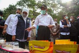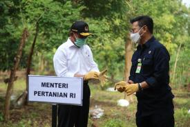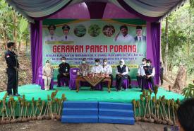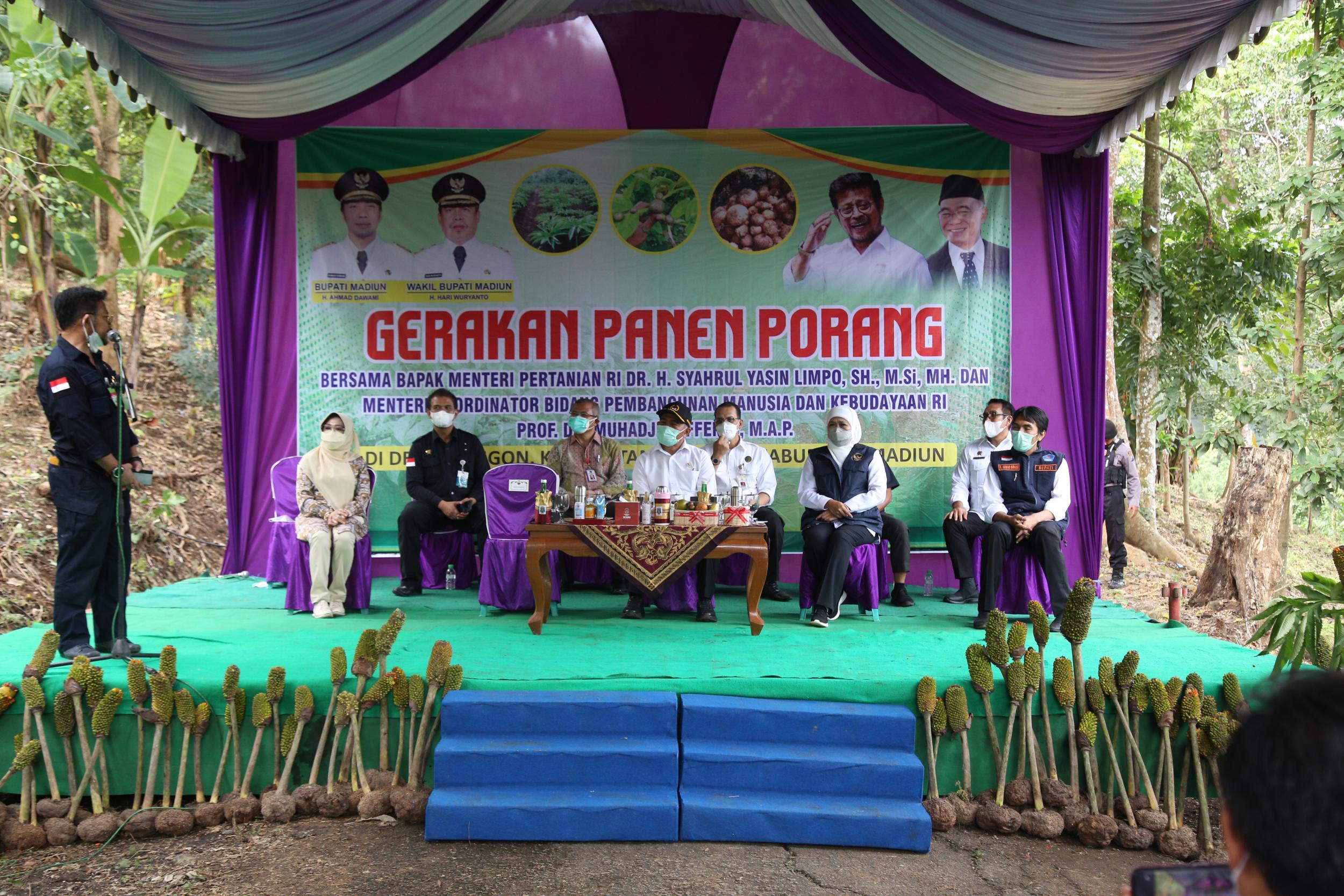 Menteri Koordinator Bidang Pembangunan Manusia dan Kebudayaan Muhadjir Effendy bersama Menteri Pertanian Syahrul Yasin Limpo dan Gubernur Jawa Timur Khofifah melakukan panen porang di sentra tanaman di Desa Klangon, Kecamatan Saradan, Kabupaten Madiun (17/5).