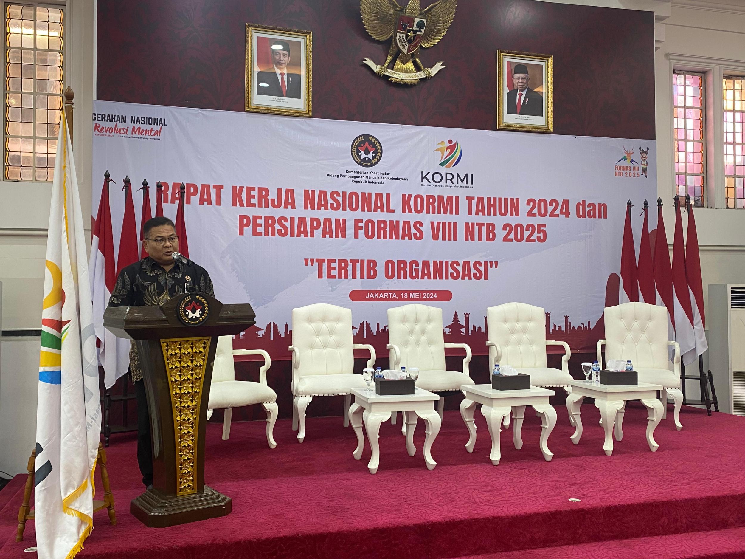 Hal tersebut disampaikan Aris saat menyampaikan Keynote Speech dalam Rapat Kerja Nasional Komite Olahraga Masyarakat Indonesia (KORMI) Tahun 2024 dan Persiapan Festival Olahraga Nasional (FORNAS) VIII NTB 2025 “Tertib Organisasi”, di Ruang Heritage, Kantor Kemenko PMK, pada Sabtu (18/5/2024).
